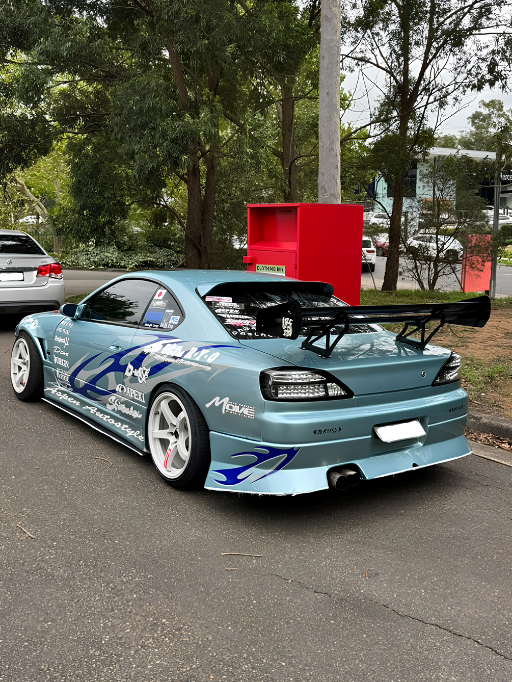 The wing is based on 13brah's S15 (Instagram: @13brah), though the exact make is unknown to me. However, the wing blade and side blades appear to be a APR GT2 with custom stands and mounts.